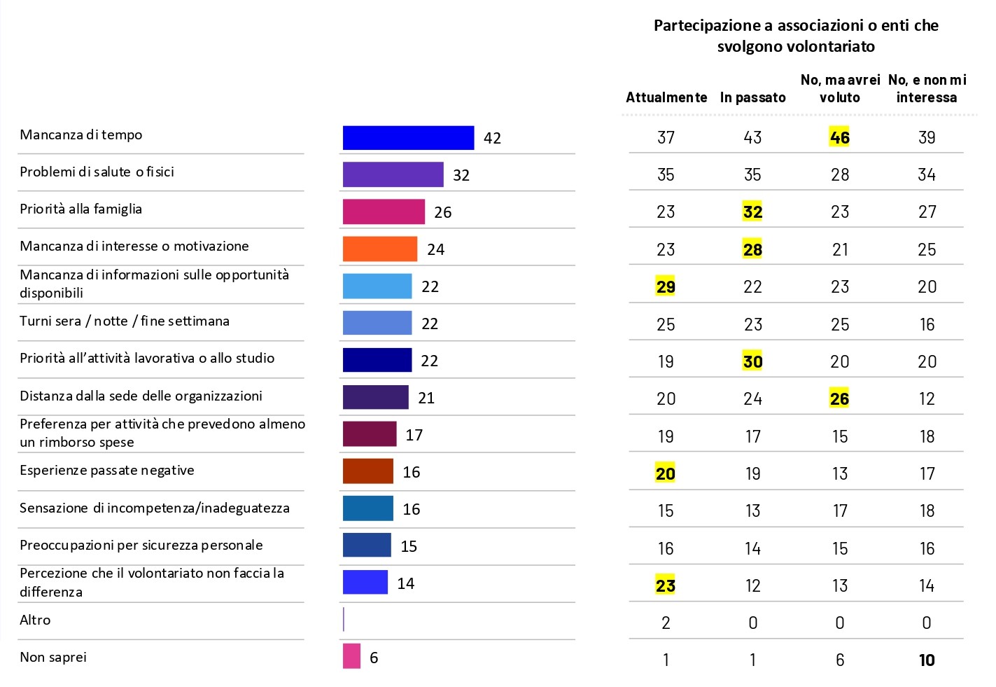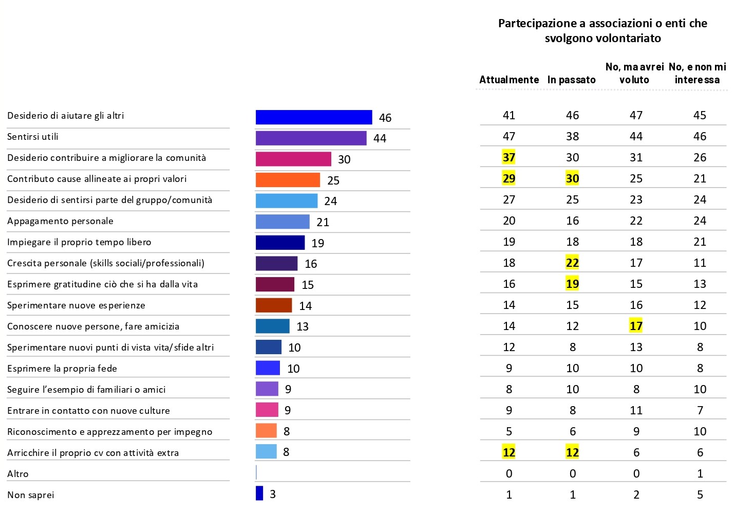 Le principali ragioni che spingono le persone a fare volontariato restano chiare: il desiderio di aiutare gli altri e quello di sentirsi utili sono indicati da quasi la metà degli intervistati. A seguire, le ragioni più altruistiche (contribuire alla comunità, alle cause vicine ai propri valori) si affiancano a quelle personali (desiderio di appartenenza, appagamento personale, utilizzo del tempo libero).