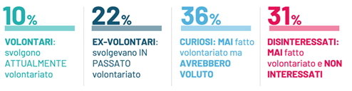 I volontari attuali hanno una maggiore rappresentanza nelle fasce d’età più anziane (50% ha 55 anni o più), mentre gli ex-volontari sono più distribuiti nelle fasce d’età centrali (54% tra i 35 e i 64 anni) e tra i curiosi il 22% ha meno di 35 anni. Il dato più interessante è relativo alle prospettive future di ingaggio: il 54% degli ex volontari vorrebbe tornare a fare volontariato nei prossimi 6 mesi (per 1 su 10 è molto probabile), percentuale che sale al 77% tra gli intervistati under 35; tra i curiosi, il 42% potrebbe iniziare a fare volontariato nei prossimi 6 mesi, percentuale che sale al 52% tra gli under 25.
