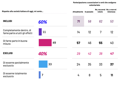 Il volontariato aumenta inoltre l’inclusione sociale: mentre 6 intervistati su 10 si sentono inclusi nella società italiana (ma solo 1 su 10 pensa di esserne parte a tutti gli effetti), il 71% dei volontari si sente incluso (14% completamente, il 57% in gran parte).
